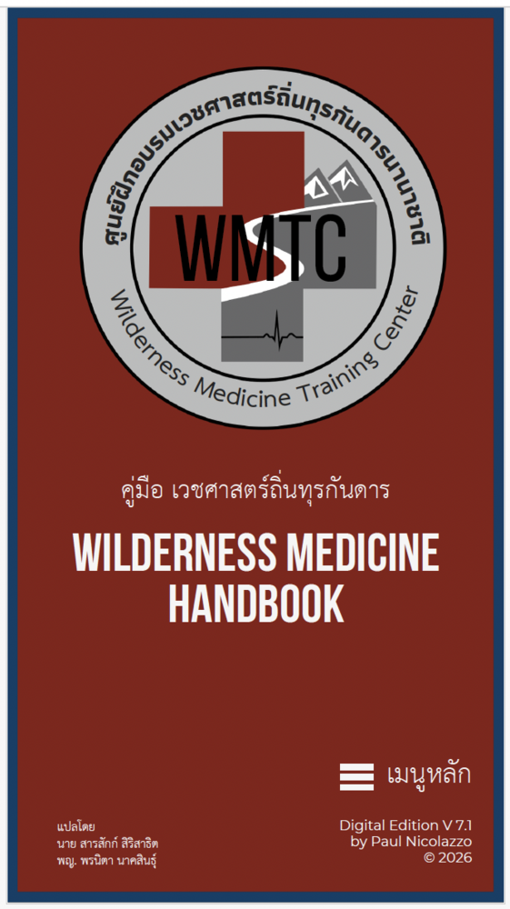 คู่มือเวชศาสตร์ ถิ่นทุรกันดาร (Wilderness Medicine Handbook) ฉบับดิจิทัล เวอร์ชัน 7.1 ของสถาบัน Wilderness Medicine Training Center International สำหรับอุปกรณ์พกพาทุกรุ่น ฉบับภาษาไทย คู่มือนี้เป็นไฟล์ PDF แบบโต้ตอบได้ และควรเปิดและบันทึกไว้ในโปรแกรม Adobe Acrobat Reader เวอร์ชันปัจจุบัน เพื่อการใช้งานที่ดีที่สุดทั้งแบบออนไลน์และออฟไลน์